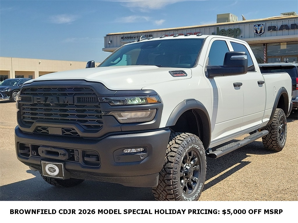 This 2026 Ram 2500 Tradesman in Bright White Clearcoat comes with the following features: 6.4L V8 8-Speed Automatic 4WD Power Wagon Package (Base Engine Controller, Black Wheel Center Hub, Black Wheel Flares, Front Disconnecting Stabilizer Bar, Front Electric Winch, Front Performance Tuned Shock Absorbers, Fuel Tank Skid Plate Shield, ParkSense Front/Rear Park Assist System, Powder Coated Front Bumper, Powder Coated Rear Bumper, Raised Ride Height, RAM Articulink Suspension, Rear Performance Tuned Shock Absorbers, Rear Wheelhouse Liners, and Wheels: 17" x 8.0" Black Painted Aluminum), Quick Order Package 2UA Tradesman, Tradesman Level 1 Equipment Group (12" Touchscreen Display, 400W Inverter, 4G LTE Wi-Fi Hot Spot, Apple CarPlay, Auto-Dimming Rear-View Mirror, Connectivity - US/Canada, Disassociated Touchscreen Display, Emergency Vehicle Alert System (EVAS), Exterior 115V AC Outlet, For Details, Visit DriveUconnect.com, For More Info, Call 800-643-2112, Google Android Auto, GPS Antenna Input, GPS Navigation, HD Radio, Off-Road Info Pages, Rear Power Sliding Window, Selectable Tire Fill Alert, SiriusXM Radio Service, Tinted Acoustic Windshield Glass, and Trailer Tow Pages), 2 Way Rear Headrest Seat, 4 Way Front Headrests, 4-Wheel Disc Brakes, 40/20/40 Split Bench Seat, 6 Speakers, ABS brakes, Air Conditioning, AM/FM radio: SiriusXM, Apple CarPlay/Android Auto, Black Exterior Mirrors, Brake assist, Clearance Lamps, Compass, Delay-off headlights, Driver door bin, Dual front impact airbags, Dual front side impact airbags, Electronic Stability Control, Front anti-roll bar, Front Center Armrest w/Storage, Front fog lights, Front License Plate Bracket, Front reading lights, Fully automatic headlights, Heavy Duty Vinyl 40/20/40 Split Bench Seat, Illuminated entry, Low tire pressure warning, Manual Adjust 4-Way Driver Seat, Manual Adjust 4-Way Front Passenger Seat, Manual Folding Exterior Mirrors, Mopar Black Tubular Side Steps, MyFlexCare Service Plan, Occupant sensing airbag, Outside temperature display, Overhead airbag, Overhead console, Panic alarm, ParkView Rear Back-Up Camera, Passenger door bin, Passenger vanity mirror, Power steering, Power windows, Radio data system, Rear anti-roll bar, Rear Folding Seat, Rear step bumper, Rear window defroster, Remote keyless entry, Remote USB Port - Charge Only, Speed control, Storage Tray, Tachometer, Tilt steering wheel, Traction control, Variably intermittent wipers, Voltmeter, and Wheels: 17" x 7.5" Black Steel StyleD. Price includes: $1000 - 2026 National Bonus Cash . Exp. 01/05/2026